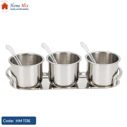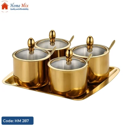 طقم شاي وسكر أنيق باللون الذهبي العصري، مكون من 4 برطمان استانلس مع ملاعق وصينية تقديم، مثالي للسفرة ولمسة ديكورية راقية في المطبخ.