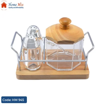 طقم أنيق يجمع بين العملية والفخامة، مكون من سكرية بغطاء خشب طبيعي وملاحتين أكريلك بيور شفاف، مع ستاند خشب زان أنيق بقاعدة معدنية لسهولة الحمل.