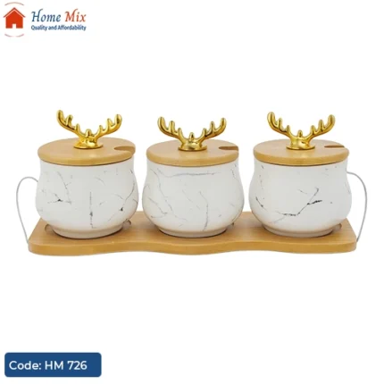 ضيفي لمسة فخامة ورقي لمطبخك مع طقم البرطمان البورسلين الغزالة، 3 قطع بغطاء خشب أنيق بمقبض غزالة جولد مع قاعدة بامبو شيك ومعلقات بورسلين عملية.