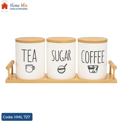 جهزي ركن الكوفي عندك بأجمل طقم بورسلين، 3 برطمان مع تراي خشب أنيق، عشان تحطي فيهم الشاي والقهوة والسكر بشكل مرتب وشيك.