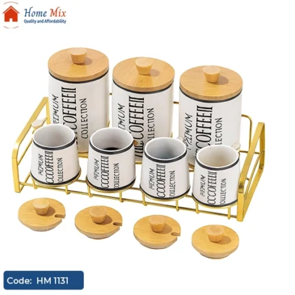 طقم بورسلين عملي وأنيق مكون من 3 برطمانات مع أغطية خشب وكوستر خشب منظم يضيف لمسة راقية لمطبخك.