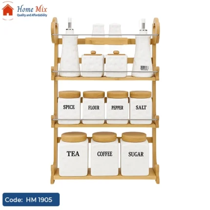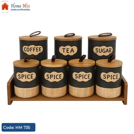 طقم أنيق من البورسلين مع غطاء خشب واستاند خشبي لتخزين وتنظيم التوابل، الشاي، القهوة، والسكر.