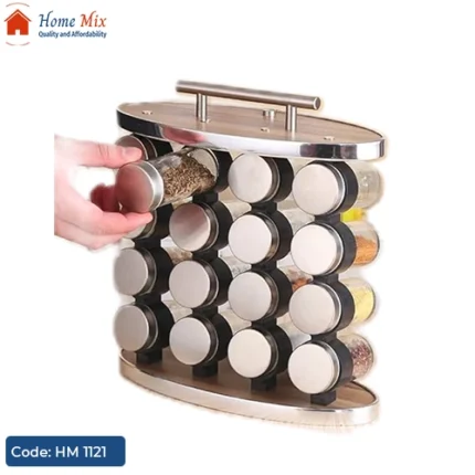 نظمي بهاراتك وتوابلك بأسلوب أنيق وعملي مع طقم التوابل الزجاجي بغطاء استانلس وحامل عصري يجمع بين الاستانلس والخشب. الطقم مكوّن من 16 قطعة كاملة ومزود بيد لسهولة الحمل والتنقل داخل مطبخك.