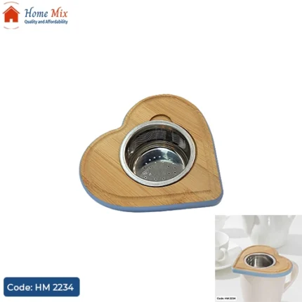 صفاية أعشاب عملية وفنية، مصنوعة من استانلس مقاوم للصدأ، مزودة بقاعدة خشب متينة لتثبيت المصفى بسهولة.