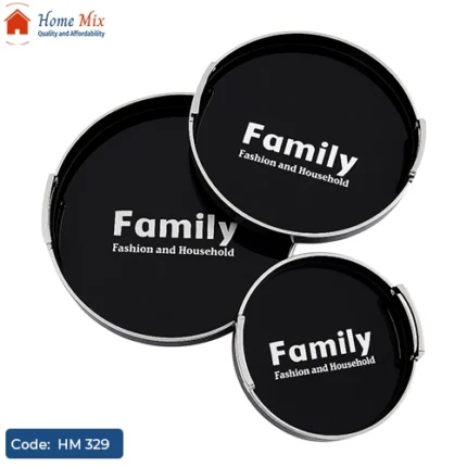أناقة الأسود مع لمسة السيلفر ✨ طقم صواني تقديم ميلامين أسود مطعم بالسيلفر بتصميم عصري ومقبض سيلفر أنيق، مكون من 3 صواني بأحجام مختلفة – مثالي للتقديم الراقي في كل مناسبة.