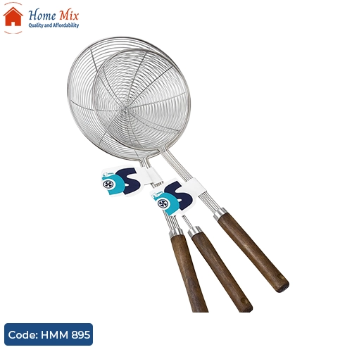 شيالة عملية لتصفية وتقديم المقليات، مصنوعة من خامة استانلس مقاومة للصدأ مع يد خشب مريحة للاستخدام اليومي.