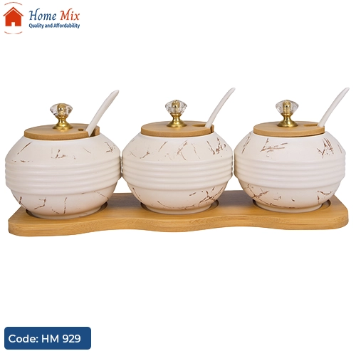 الطقم يتكون من 3 برطمانات بتصميم رخامي مميز لحفظ التوابل أو السكر أو الملح.
