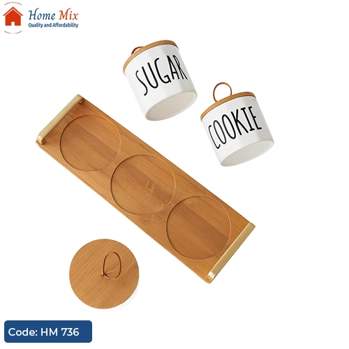الطقم مكون من 3 برطمانات بورسلين عالية الجودة مكتوب عليهم بشكل واضح (مثل Sugar – Cookie …) لتسهيل الاستخدام، ومعاهم أغطية خشب طبيعية تحافظ على المحتويات طازجة.