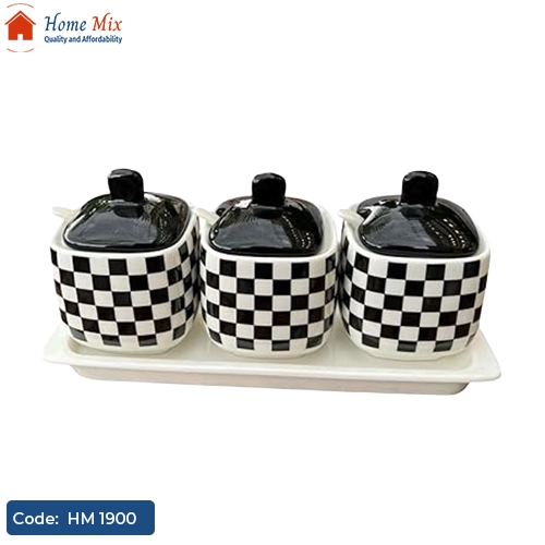 الطقم مزود بـ 3 برطمانات بورسلين بغطاء محكم + 3 معالق بورسلين وحامل أنيق بنفس الخامة لسهولة الاستخدام والتنظيم.