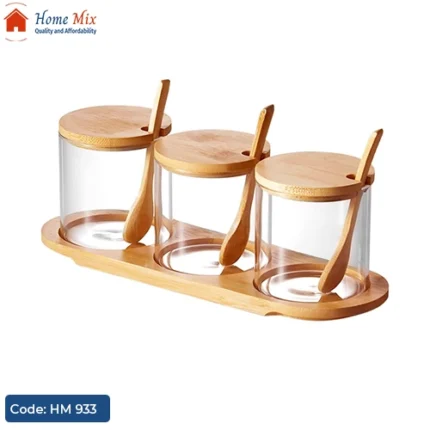 طقم توابل زجاج مدور بغطاء بامبو – 3 قطع