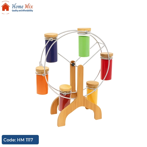 طقم توابل أنيق مكون من 6 برطمانات زجاج بغطاء خشب، مع ستاند معدن وخشب بتصميم ساقية مميز يضيف لمسة ديكور عصرية لمطبخك.