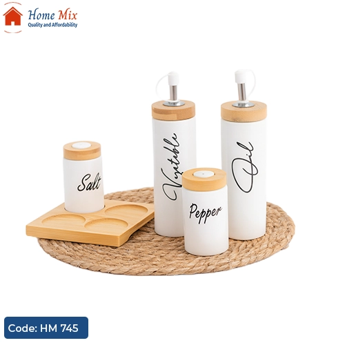 طقم أنيق من البورسلين لحفظ الزيت والتوابل، مكون من 4 قطع مع استاند خشب بامبو عملي يضيف لمسة عصرية لمطبخك.