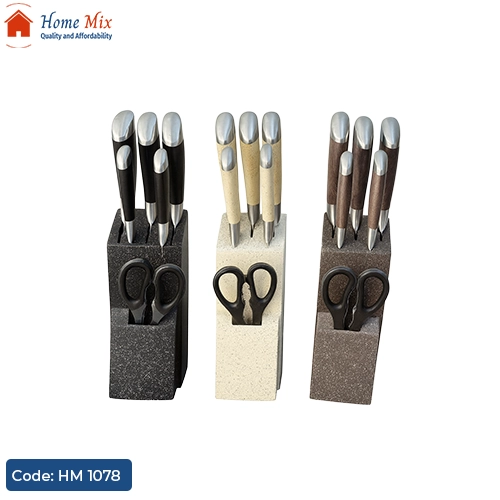 الطقم يتكون من 5 سكاكين بأحجام مختلفة تناسب جميع احتياجاتك اليومية، بالإضافة إلى مقص عملي وحامل أنيق لترتيب الأدوات.