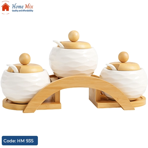 الطقم يتكون من 3 برطمانات بورسلين بتصميم عصري، مزودة بغطاء خشب بامبو للحفاظ على النكهة والطزاجة.