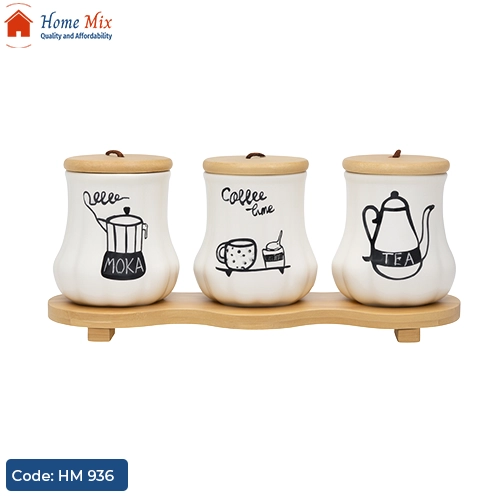 طقم كوفي كورنر عصري من 3 برطمانات بورسلين مضلع برسومات أنيقة، مع أغطية خشب بامبو وملاعق بورسلين، مزود بتراي تقديم خشب بامبو.