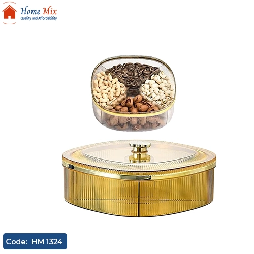 علبة تسالي أكريليك أنيقة بخمس خانات عملية لحفظ التسالي، المكسرات، الكاندي أو الشوكولاتة، بتصميم فاخر بحواف جولد.