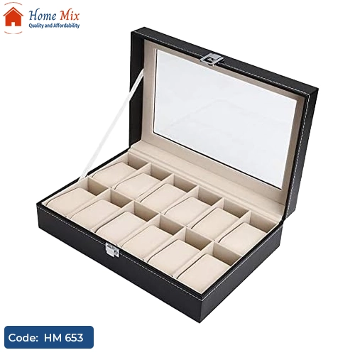 منظم ساعات جلد بغطاء شفاف – 12 خانة لحفظ الساعات والإكسسوارات