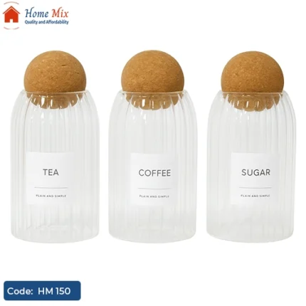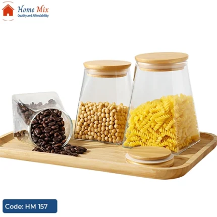 الطقم بيتكون من 3 برطمان بورسلين بسعة 700 مللى، بغطاء محكم يحافظ على المحتويات طازة، ومعاهم تراي خشب عملي يخلي كل حاجة متجمعة ومنظمة قدامك.