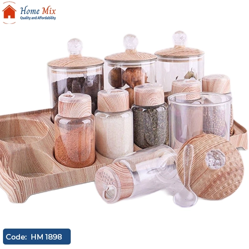 البرطمانات بغطاء محكم بجوان لمنع التسريب وحفظ النكهات طازة، ومعاهم قاعدة بلاستيك عملية بتساعدك ترتبي التوابل بسهولة وتوفري في المساحة.