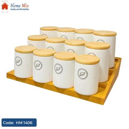 رتبي بهاراتك بكل أناقة مع طقم التوابل البورسلين 12 قطعة بغطاء خشب محكم الغلق.